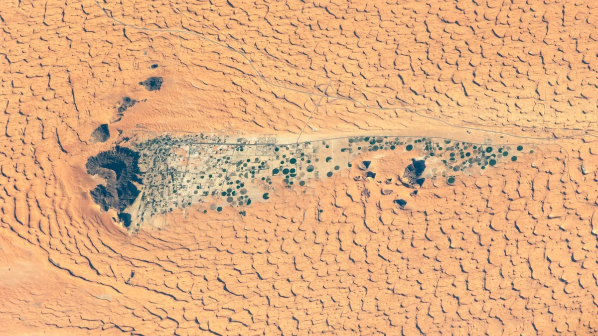 This intriguing astronaut photo shows an oasis town and crop circles lurking within the shadowy tail of a “camel-hump” mountain in the harsh Saudi Arabian desert. The unlikely settlement lies within an ancient lake bed and is home to rock art dating back thousands of years.
